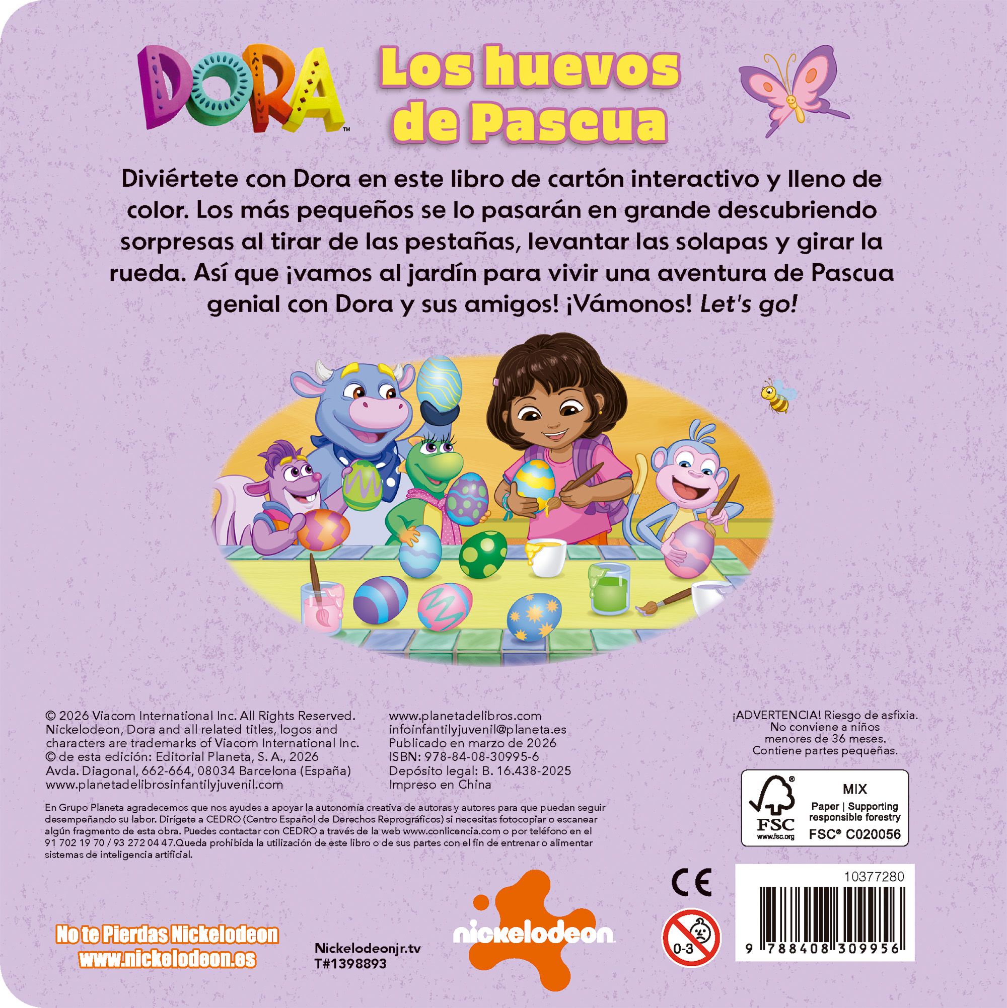 Los más pequeños se lo pasarán en grande descubriendo sorpresas al tirar de las pestañas, levantar las solapas y girar la rueda. Así que ¡vamos al jardín para vivir una aventura de Pascua genial con Dora y sus amigos! ¡Vámonos! Let's go!