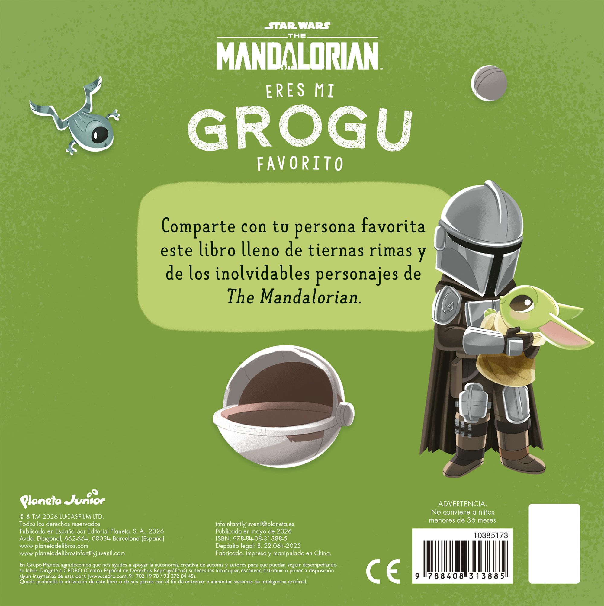 Un libro perfecto para celebrar el orgullo Star Wars lleno de personajes adorables de la serie The Mandalorian: Grogu, Ahsoka, Luke, Mando... Este libro de cartón nos invita a iniciar una rutina para ir a dormir acompañada de mensajes rimados llenos de amor incondicional para acabar el día con abrazos y palabras bonitas.Recomendado a partir de 6 meses. ...