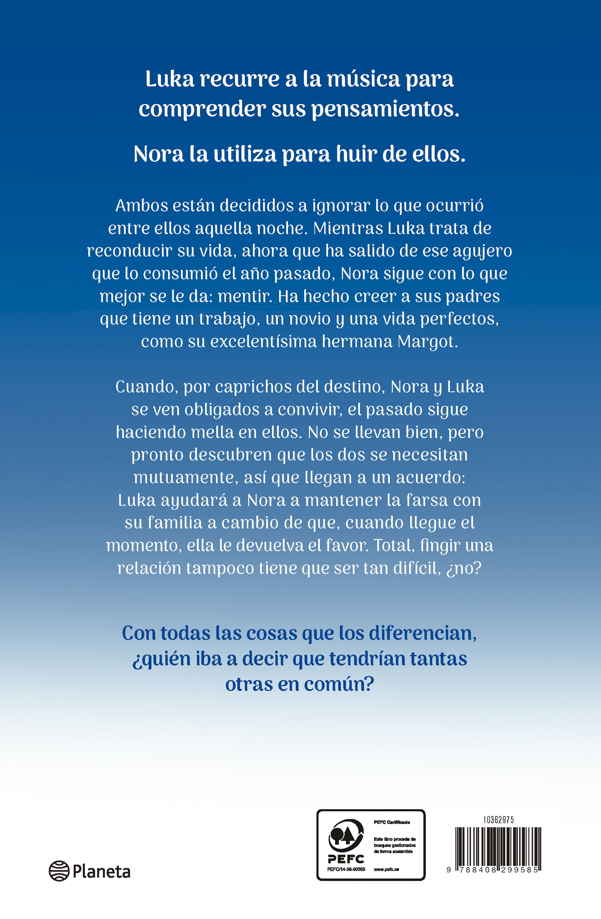 Ambos están decididos a ignorar lo que ocurrió entre ellos aquella noche. Mientras Luka trata de reconducir su vida, ahora que ha salido de ese agujero que lo consumió el año pasado, Nora sigue con lo que mejor se le da: mentir. Ha hecho creer a sus padres que tiene un trabajo, un novio y una vida perfectos, como su excelentísima hermana Margot.